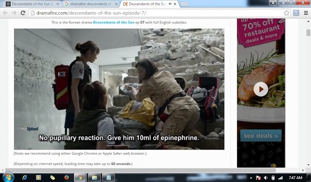sedang menonton drama korea Descendants of The Sun yang aku copy dari teman tapi cuma sampai episode 6 jadi aku streaming online episode 7-9 dan menurut artikel yang aku baca katanya drama ini berumur sampai episode 16 keren banget karena membahas tentang international issues seperti perang dan hubungan diplomatik dan menjaga perdamaian dan relawan dokter dan tentara peacekeeper dan sebagainya